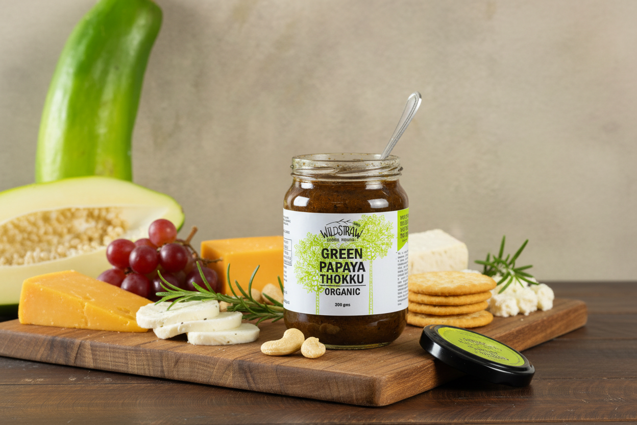 A bold, tangy South Indian relish made with green papaya.