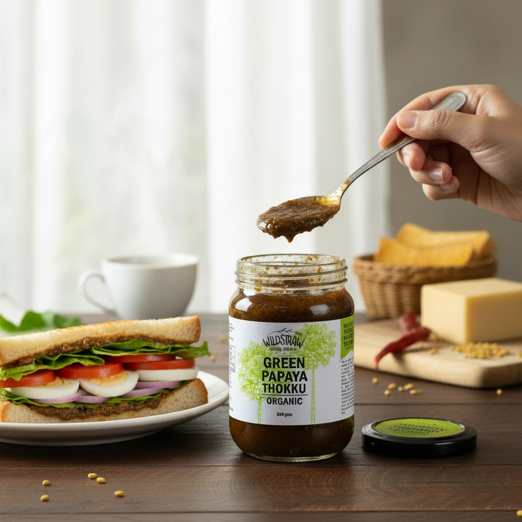 Green papaya is a powerhouse of nutrients — especially papain, an enzyme that supports digestion by breaking down proteins into amino acids. We slow-cook this wonder fruit with cold-pressed sesame oil, tamarind and freshly ground spices to create a tangy, slightly spicy, deeply nourishing 'thokku'.